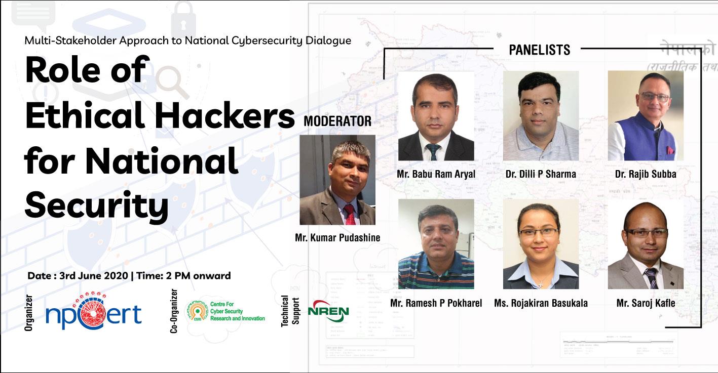 Information Security Response Team Nepal (npCert) in association with the Center For Cyber Security Research and Innovation (CSRI) is all set to host the Role of Ethical Hackers for National Security Strategic Development on June 3rd, 2020 (Wednesday) from 2 PM to 3:30 PM.
