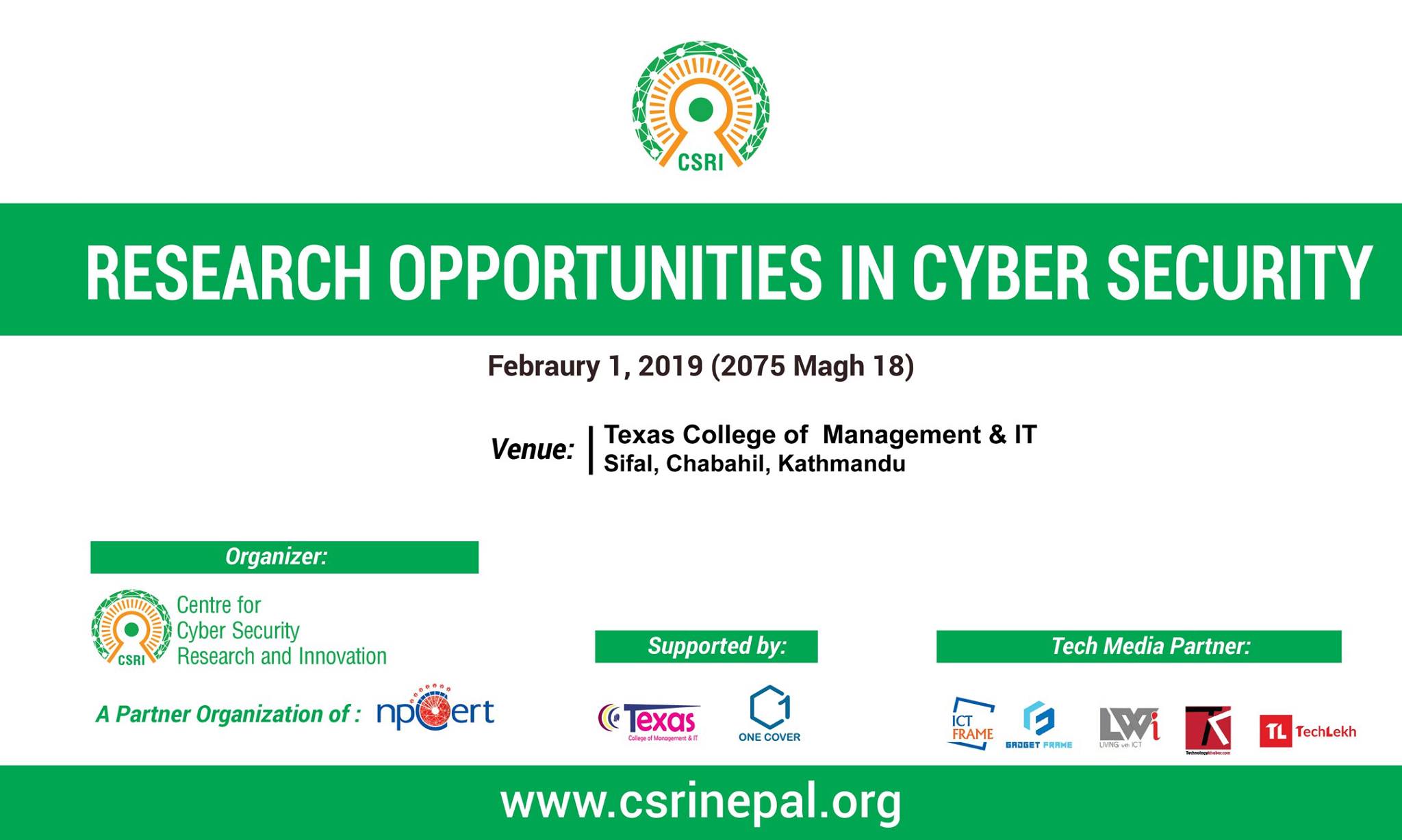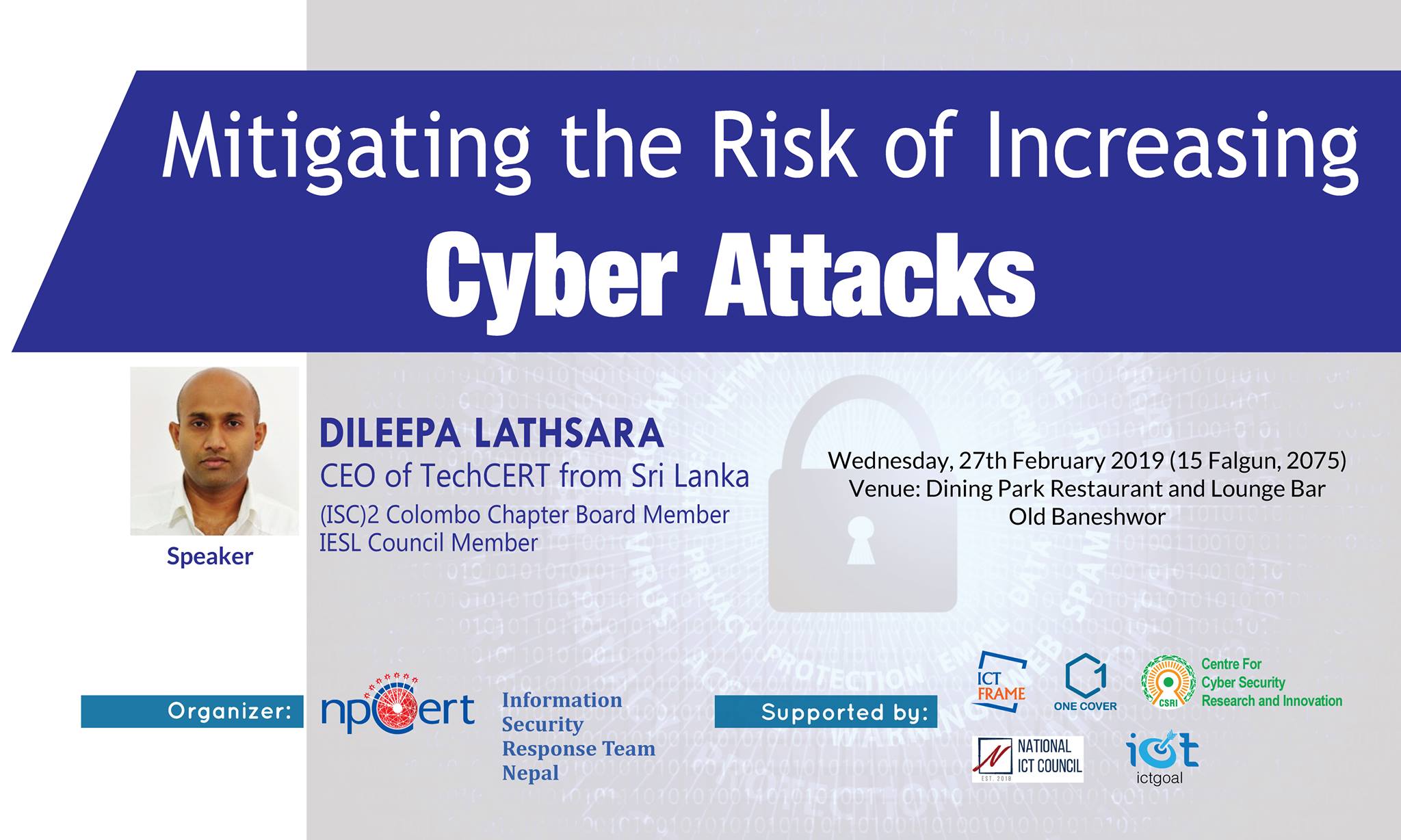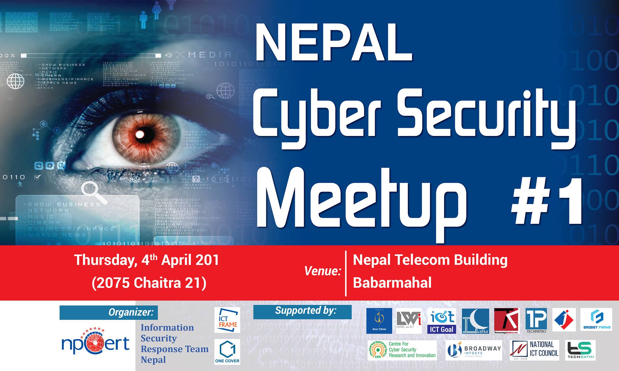 npCert, Centre For Cyber Security Research and Innovation, One Cover Pvt. Ltd. in partnership between ICTFRAME.COM is organized a Nepal CyberSecurity Meetup #1 at Nepal Telecom Building Babarmahal, Kathmandu, Nepal.